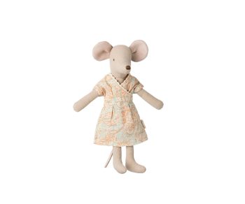 Maileg’s Mum Mouse is a 15-cm mouse made of cotton with recycled filling, dressed in a skirt and a cheese-themed handbag. Removable clothing and included accessories make her ideal for playtime, decorating dollhouses, or completing Maileg families. Recommended for children ages 3 and older. (Maileg brand)