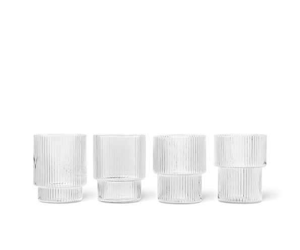 The Ripple Clear set from Ferm Living features mouth-blown glass tumblers with a vertical rippled surface, a transparent finish that lets the drink shine with purity. Each piece is lightweight, elegant, and functional, ideal for lunch, dinner, or everyday use. Dishwasher-safe, they coordinate perfectly with other pieces in the Ripple collection. Ripple tumblers are made of mouth-blown glass with a vertical rippled surface. There are several versions: standard drinking glasses, low glasses, wine glasses, sets of 4 or 2, long drink glasses, and more. (Ferm Living Brand)