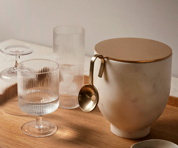 The Ripple Clear set from Ferm Living features mouth-blown glass tumblers with a vertical rippled surface, a transparent finish that lets the drink shine with purity. Each piece is lightweight, elegant, and functional, ideal for lunch, dinner, or everyday use. Dishwasher-safe, they coordinate perfectly with other pieces in the Ripple collection. Ripple tumblers are made of mouth-blown glass with a vertical rippled surface. There are several versions: standard drinking glasses, low glasses, wine glasses, sets of 4 or 2, long drink glasses, and more. (Ferm Living Brand)