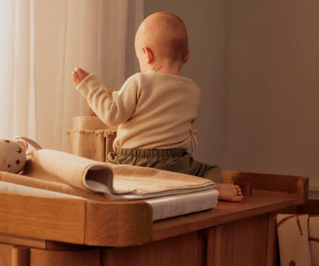 The Tilu changing unit from ferm LIVING is a stylish and functional baby changing table that combines contemporary Scandinavian design with natural materials. Made from FSC™ certified oak, it features smooth lines and balanced proportions, discreetly integrating open storage space to keep essentials within easy reach. Designed for comfort and safety during diaper changes, the Tilu stands out for its robust construction and minimalist aesthetic, allowing it to blend harmoniously into modern children’s bedrooms. (Ferm Living brand)