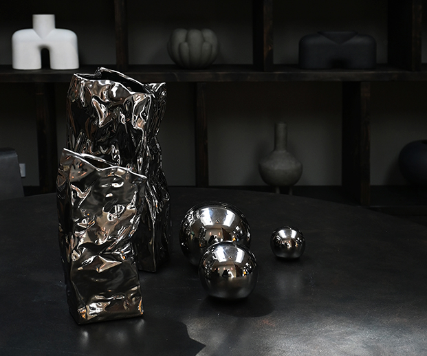 O conjunto Gallery Balls – Set de 3 da 101 Copenhagen transforma simples esferas decorativas em elementos de arte minimalista e contemporânea. Feitas em cerâmica com acabamento espelhado em cromo, cada bola reflete o ambiente ao redor, criando efeitos de luz e profundidade que mudam com a perspetiva. As três bolas vêm em tamanhos variados: grande, médio e mini , permitindo composê-las como centro de mesa, apoiar sobre prateleiras ou distribuí-las pela casa para acentos discretos e sofisticados. (Marca 101 Copenhagen)