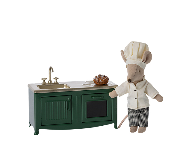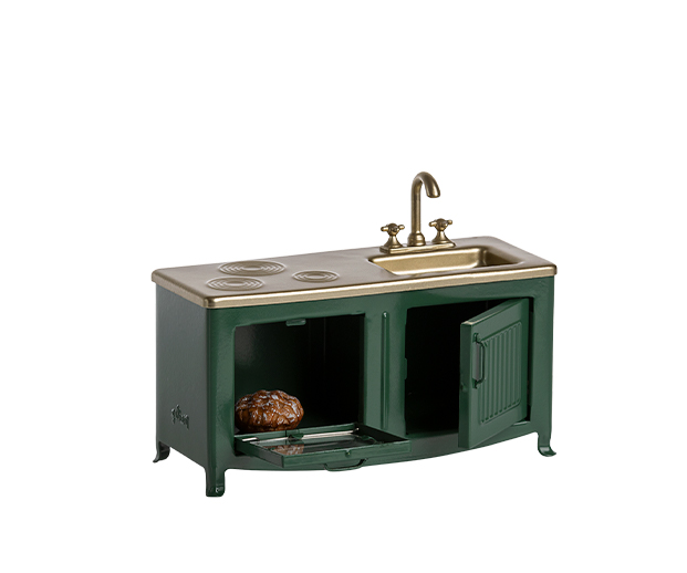 A Cozinha Verde (Dark Green Mouse Kitchen) da Maileg é uma cozinha em escala mini, feita em metal pintado vintage com detalhes em poliresina, pensada para as bonecas/ratinhos da linha mouse size. Tem lava-loiça com torneiras, forno com porta que abre, armário em baixo da pia para guardar utensílios, e vem com uma pequena miniatura de pão (polyresina). A sua cor verde escuro e acabamento metálico dão-lhe charme clássico, ideal para fantasias de casinha ou casas de bonecas, para crianças a partir dos 3 anos. (Marca Maileg)