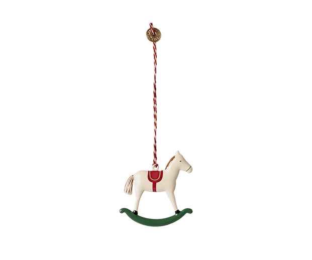 O enfeite de metal Rocking Horse da Maileg é um ornamento natalício pintado à mão em metal, com cordão para pendurar. Com aproximadamente 6 × 6 cm e acabamento artesanal detalhado, é ideal para pendurar na árvore de Natal, em galhos decorativos ou como peça de coleção. Uma adição encantadora para decoração de inverno com o charme singular da marca Maileg. (Marca Maileg)