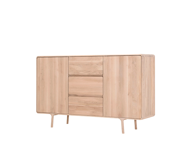 A Fawn Dresser da GAZZDA, desenhada por Salih Teskeredzic, combina linhas fluidas e silhueta elegante com a funcionalidade de armazenamento robusta: feita em carvalho maciço com acabamento em óleo vegetal (White Oil ou Natural Oil), apresenta três gavetas “push-to-open” e duas portas com fecho soft-close, largura 180 cm, profundidade 45 cm e altura 110 cm que é ideal para corredores, salas ou quartos onde se deseja design e utilidade. (Marca Gazzda)
