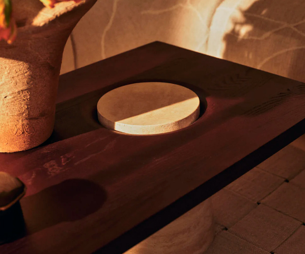 *Material: Travertino e madeira de freixo carbonizado.
