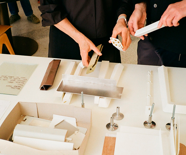madeira certificada FSC (folheado de carvalho ou nogueira) + alumínio extrudido + aço em acabamento anodizado ou lacado.
