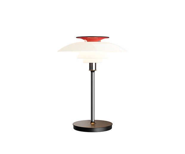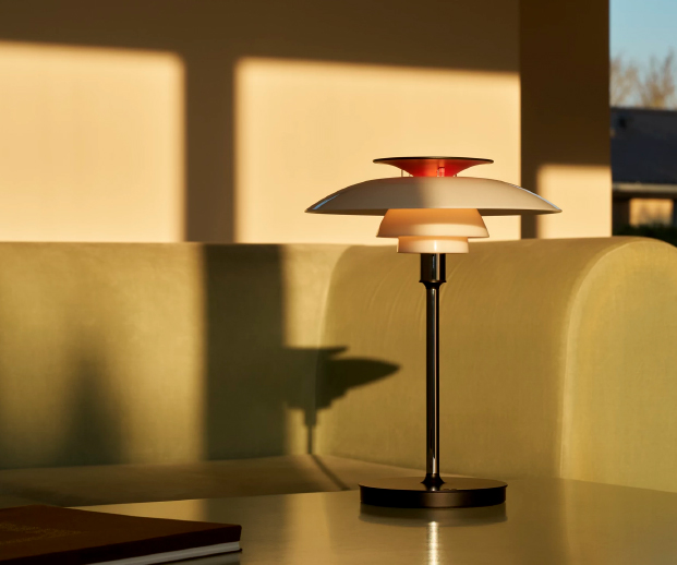 A PH 80 Portable Lamp da Louis Poulsen é um tributo ao design de Poul Henningsen, agora numa versão recarregável sem fios que combina tradição e liberdade de uso. A multi-cúpula em acrílico opal e topo colorido oferece luz difusa e sem encadeamento, enquanto a base em alumínio fundido garante presença sólida. Com dielinação moderna (USB-C, bateria interna, dim-to-warm 3000-1800K e classificação IP44), adapta-se tanto a ambientes interiores como a varandas cobertas. Ideal para mesa, bancada ou zona lounge, esta peça une canto de design histórico a funcionalidade contemporânea.(Marca Louis Poulsen)