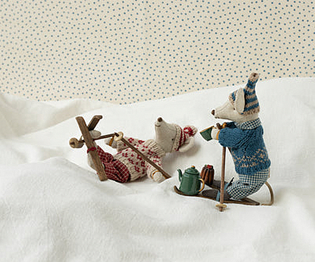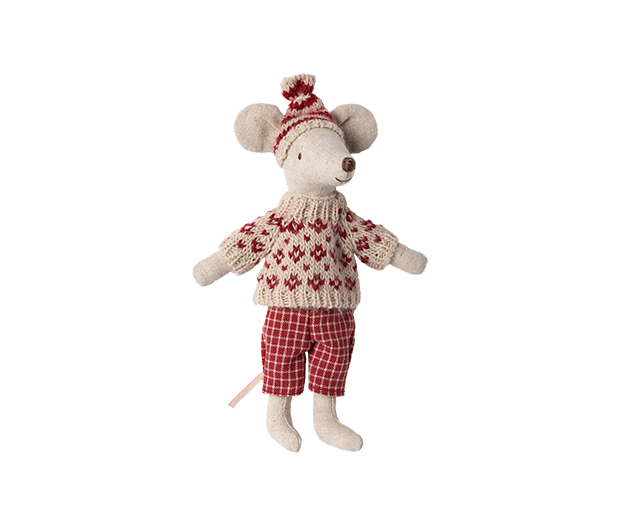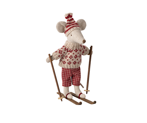 O ratinho “Mamã” da marca Maileg, da coleção de Inverno com Conjunto de Esqui (versão vermelha), mede aproximadamente 15 cm e vem vestido com roupa de neve com padrões vermelhos e creme, gorro de malha e calças acolhedoras. Inclui skis de madeira e bastões, sendo perfeito para brincadeiras imaginativas ou como peça de coleção para crianças a partir dos 3 anos. (Marca Maileg)