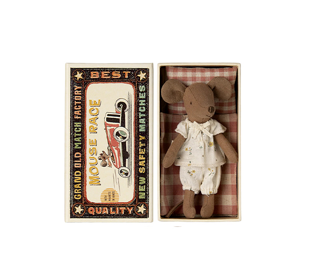 A Ratinha Irmã Mais Velha Maileg vem aconchegada na sua caixa de fósforos transformada em cama — com lençóis macios e roupinhas estampadas únicas. Mede cerca de 13 cm, feita em tecido suave com enchimento reciclado, e convida a histórias imaginativas e colecionismo em famílias Maileg. Ideal para crianças +3 anos ou como presente encantador.(Marca Maileg)