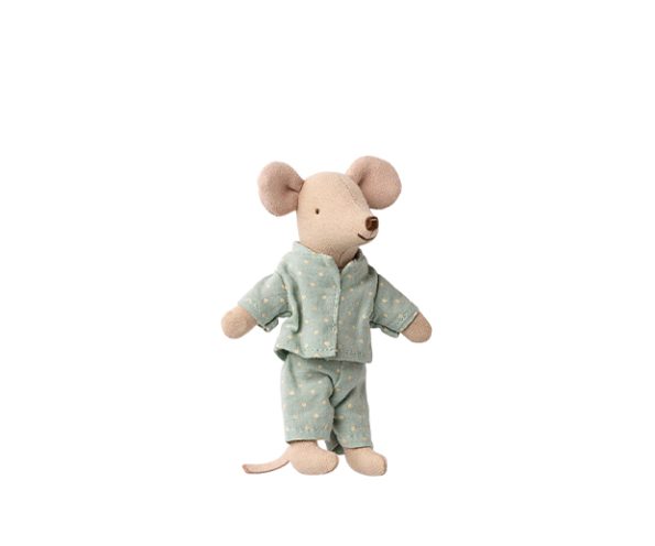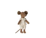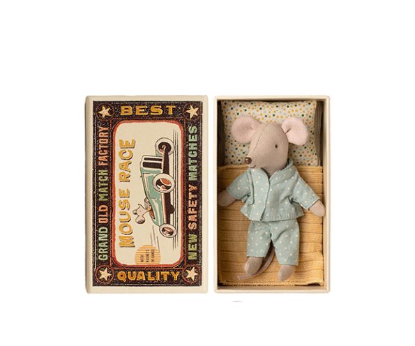 O Little Brother Mouse in Matchbox da Maileg é um ratinho fofo de ~11 cm que dorme aconchegado na sua caixa de fósforos com cama macia. Feito em tecidos suaves e materiais reciclados, inclui roupa de cama e roupas estampadas únicas, ideal para brincadeiras imaginativas, colecionadores ou como presente encantador para crianças a partir dos 3 anos.(Marca Maileg)