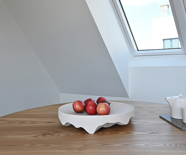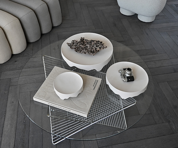 O tabuleiro Iwa Tray da 101 Copenhagen transforma o utilitário em escultura: o topo circular liso em cerâmica vidrada contrasta com a base de textura rugosa que evoca pedra fragmentada. Disponível em três tamanhos (Mini, Medio, Big), este tabuleiro combina minimalismo nórdico com presença contemplativa que é ideal para servir, expor ou decorar com estilo. (Marca 101 Copenhagen)