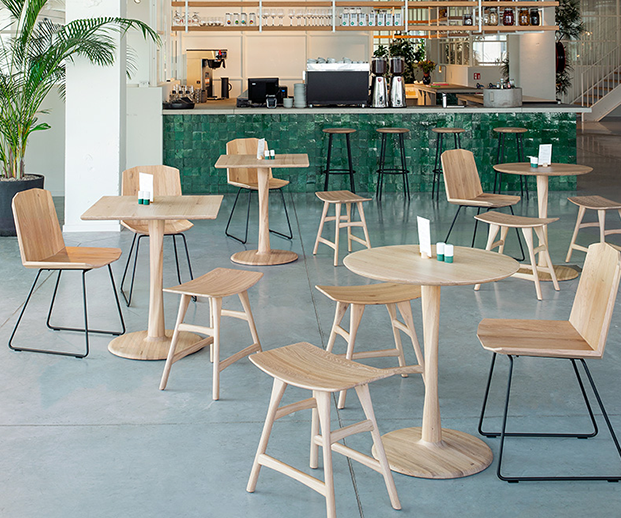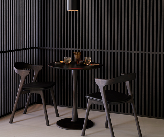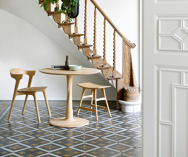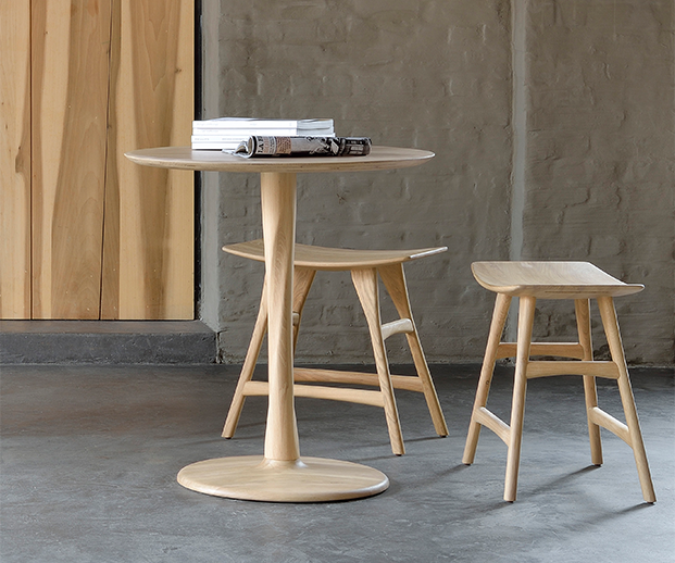 Leve e com nuances subtis, a mesa de jantar Torsion em carvalho maciço castanho incorpora técnicas avançadas de marcenaria para criar um tampo leve com uma base torneada de elegância escultural. (Marca Ethnicraft)